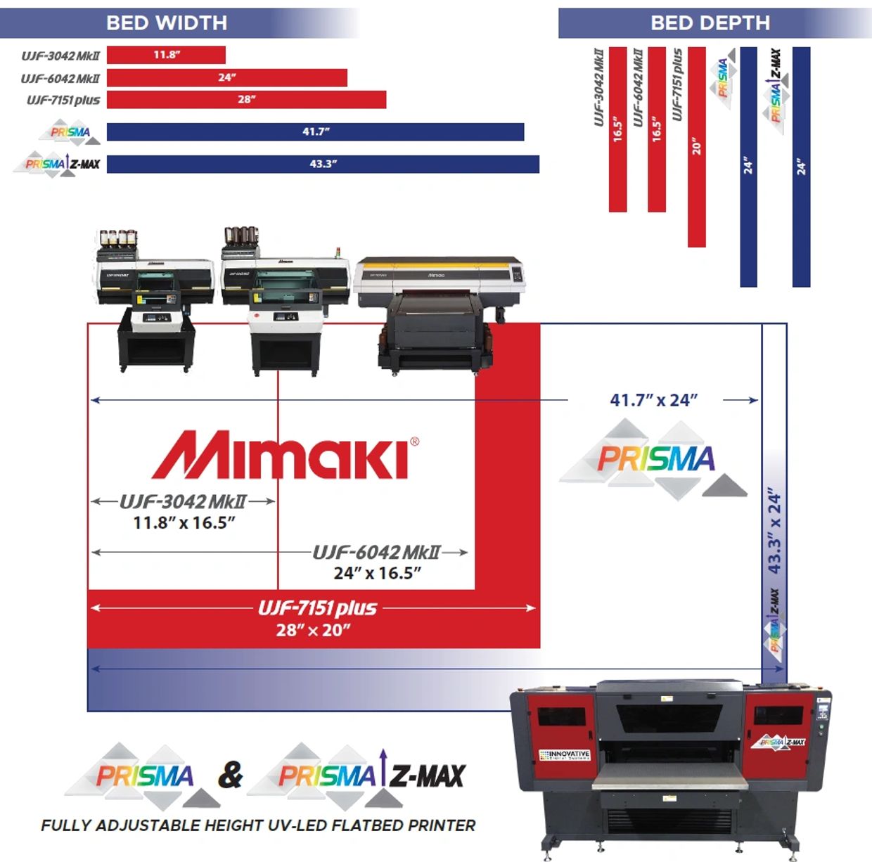 We have a number of different flatbed printers to chose from. Mostly people select a printer first based on print area depending on the size of items they wish to print on. Here is a chart that shows the print area and how much depth adjustment our most common units have.